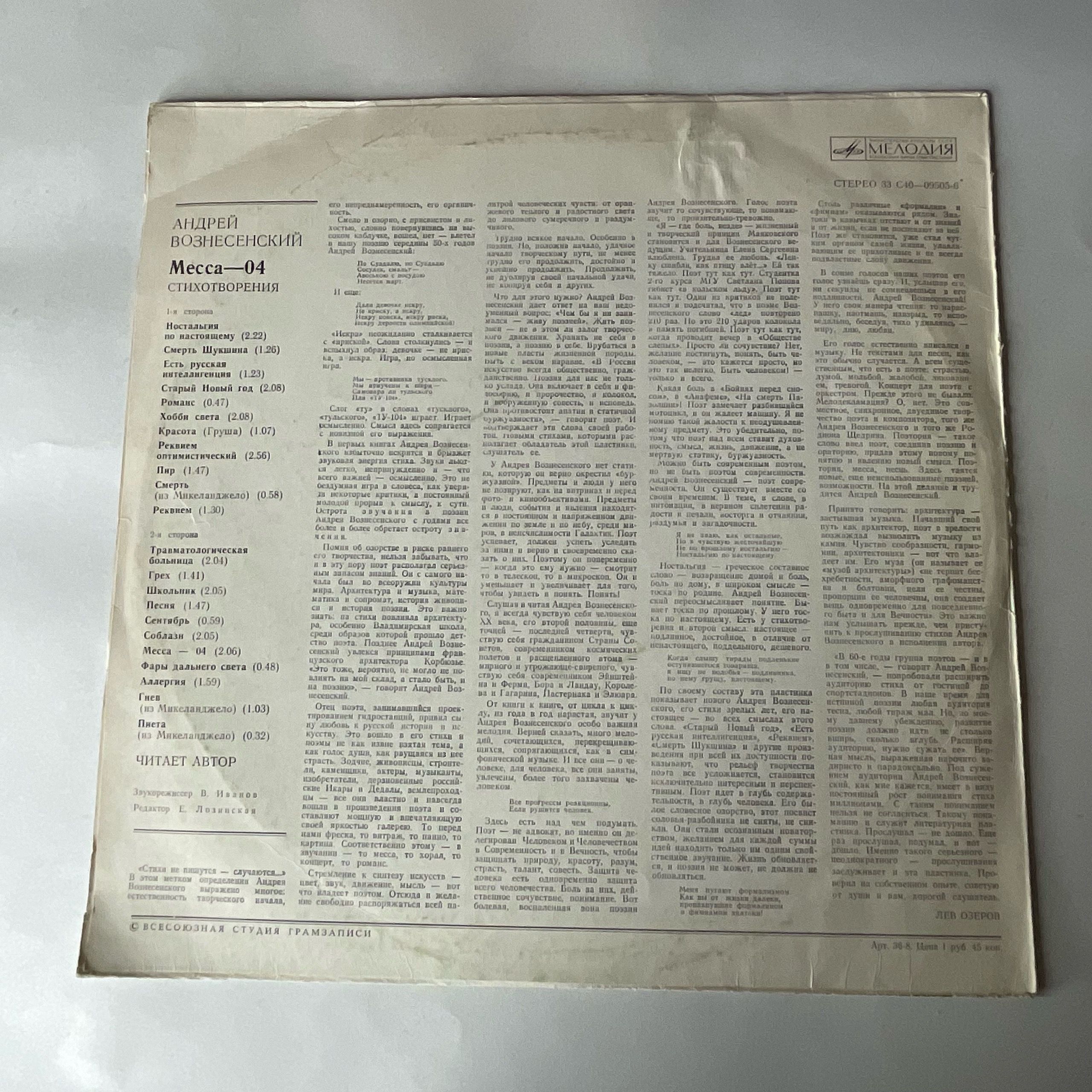 Винтажная виниловая пластинка LP Андрей Вознесенский Месса 04 (СССР 1977)