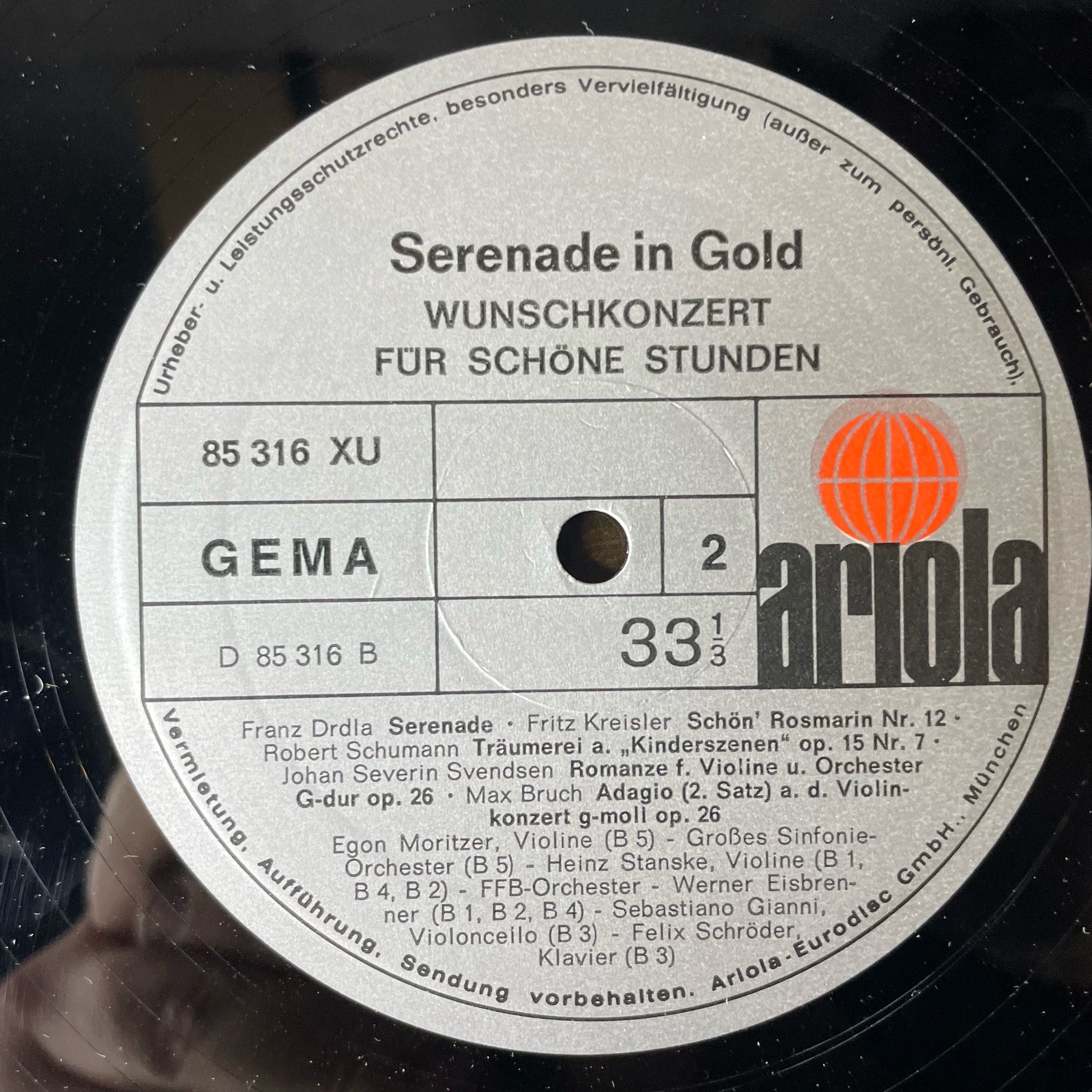 Комплектуется новым внешним и антистатическим конвертом. Подробную информацию о состоянии пластинки/конверта, страны производства и год выпуска можно узнать в разделе "Характеристики".Винтажная виниловая пластинкаA1 Enrico Toselli– Serenade Op.6 Nr.1 „Toselli Serenade”,A2 Jonny Heykens– Standchen,A3 Fritz Kreisler– Liebesfreud Nr.10,A4 Zdenek Fibich– Poeme Op.41 Nr.6,A5 Anton Rubinstein– Melodie F-dur Op.3 Nr.1,B1 Frantsek Drdla– Serenade,B2 Fritz Kreisler– Schon’ Rosmarin Nr.12,B3 Robert Schumann– Traumerei Aus „Kinderszenen“ Op.15 Nr.7,B4 Johan Svendsen– Romanze Fur Violine Und Orchester G-dur Op.26,B5 Max Bruch– Adagio (2.satz) Aus Dem Violinenkonzert G-moll Op.26,C1 Joseph Haydn– Serenade C-dur (Andante Cantabile) Aus Dem Streichquartett F-dur Op.3 Nr.5,C2 Luigi Boccherini– Menuett A-dur Aus Dem Streichquartett E-dur Op.13 Nr.5,C3 Edvard Grieg– Hochzeitstag Auf Troldhaugen Aus „Lyrische Szenen“ Op.65 Nr.6,C4 Franz Schmidt– Zwischenspiel Aus Der Oper „Notre Dame“,D1 Bedrich Smetana– Ouverture Zu Der Oper „Die Verkaufte Braut“,D2 Antonín Dvorak– Slawischer Tanz Nr.8 G-moll Op.45,D3 Johannes Brahms– Ungarischer Tanz Nr.5 D-dur,D4 Jean Sibelius– Valse Triste Aus Der Schauspielmusik, Zu „Kuolema“ Op.44 Nr.1